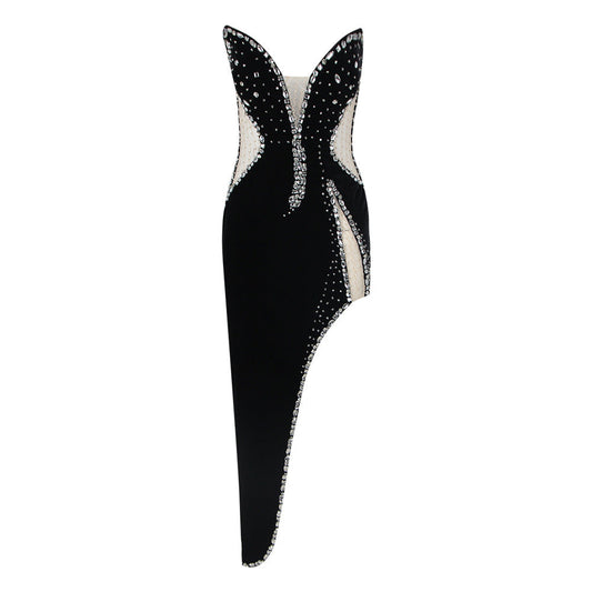 Spring Mid Length Sexy Dress Velvet Sexy High Split Beaded Heavy Industry