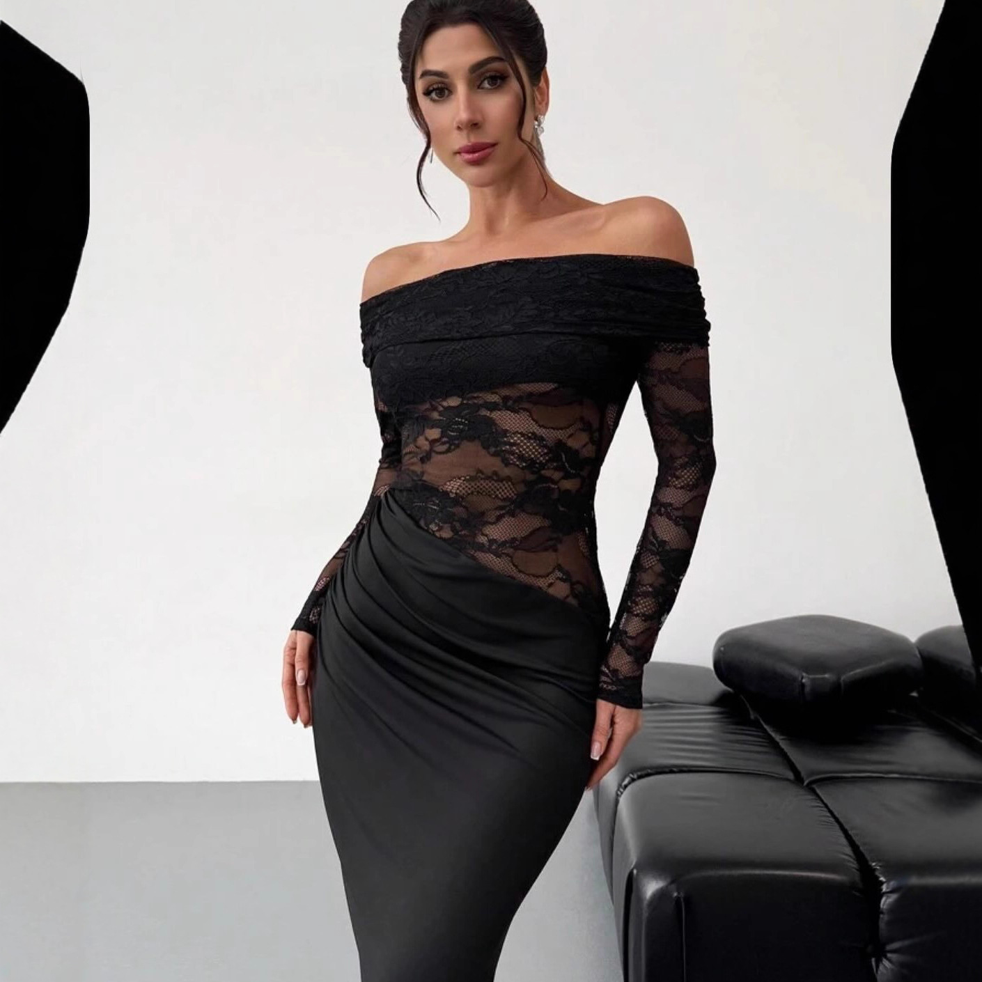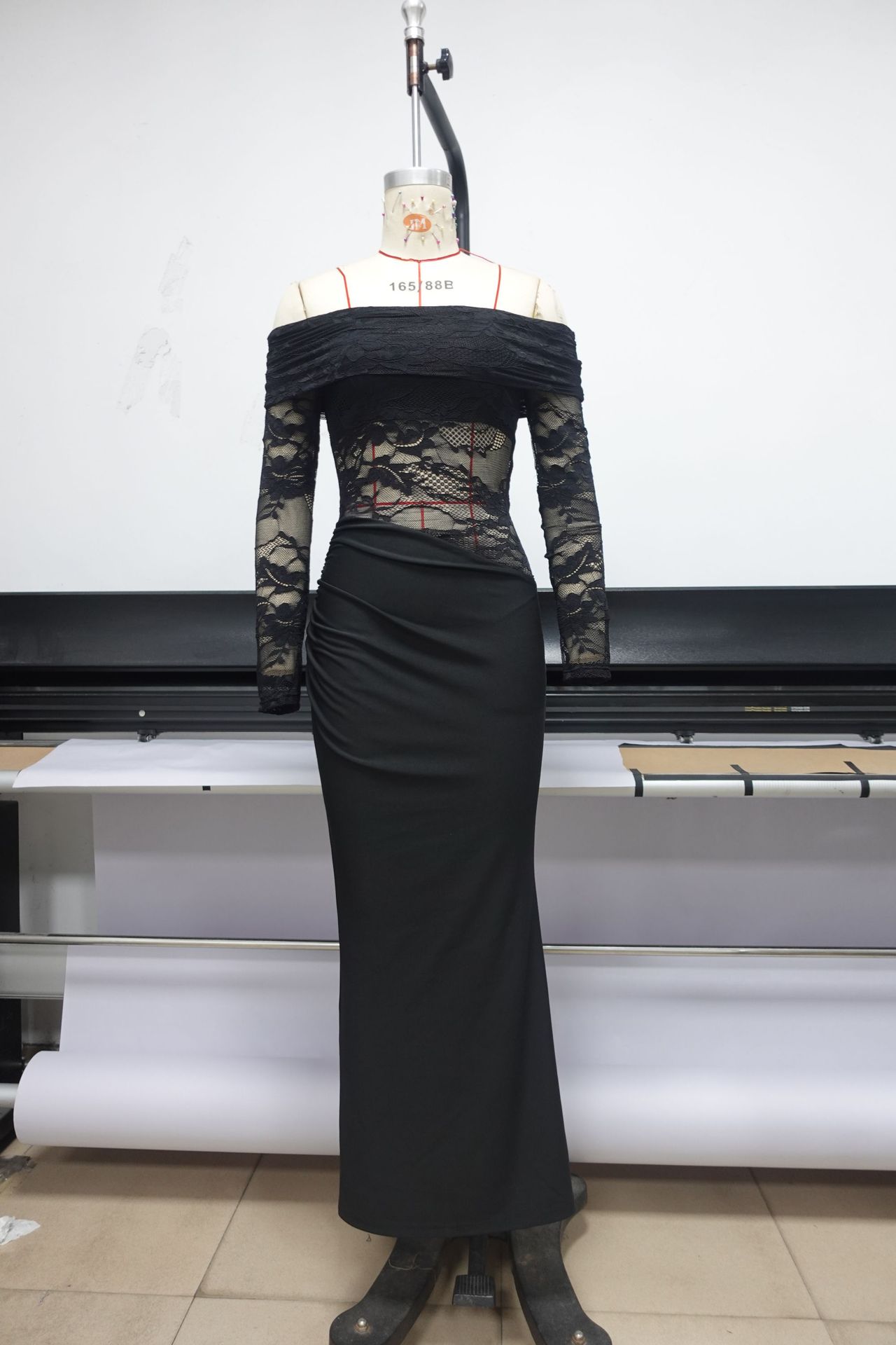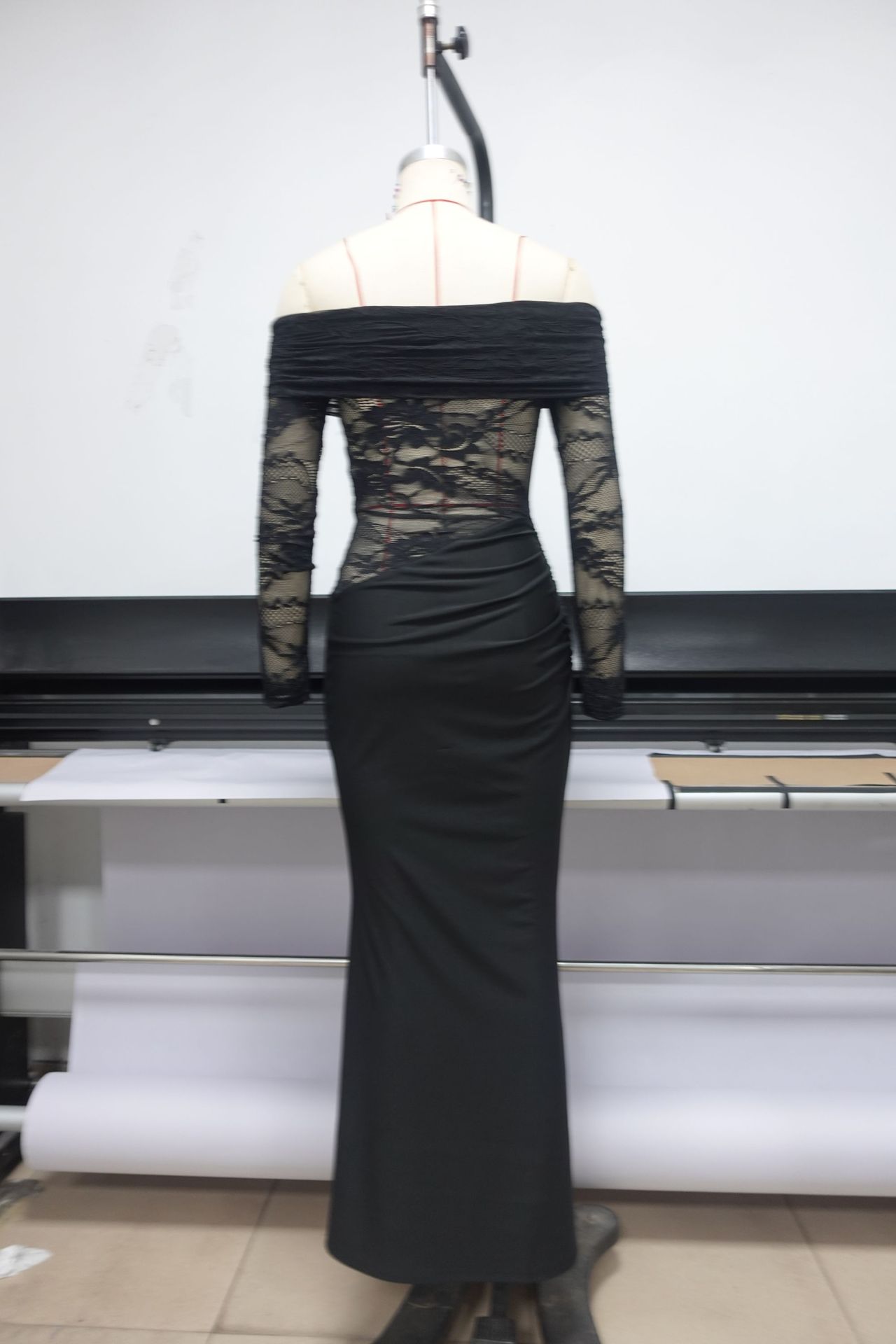Hollow Out Cutout out Summer off-Shoulder Lace Maxi Dress Long Sleeve High Grade Sexy Sheath Dress Women Clothing
