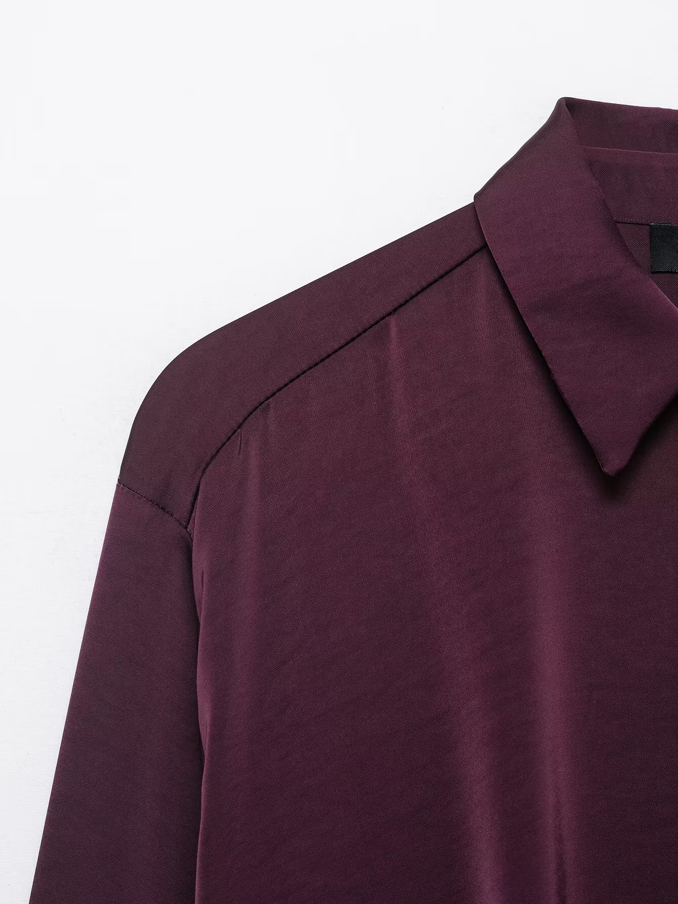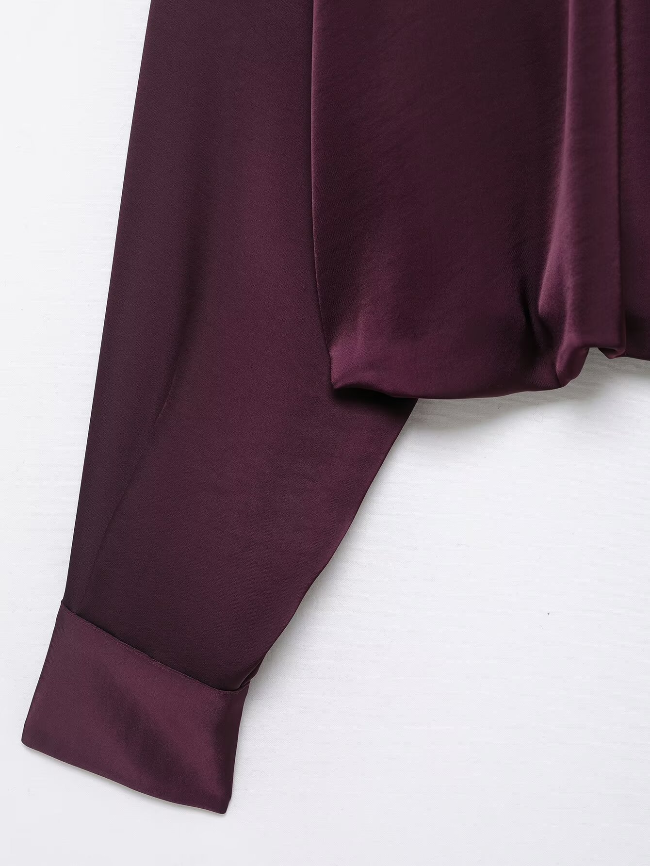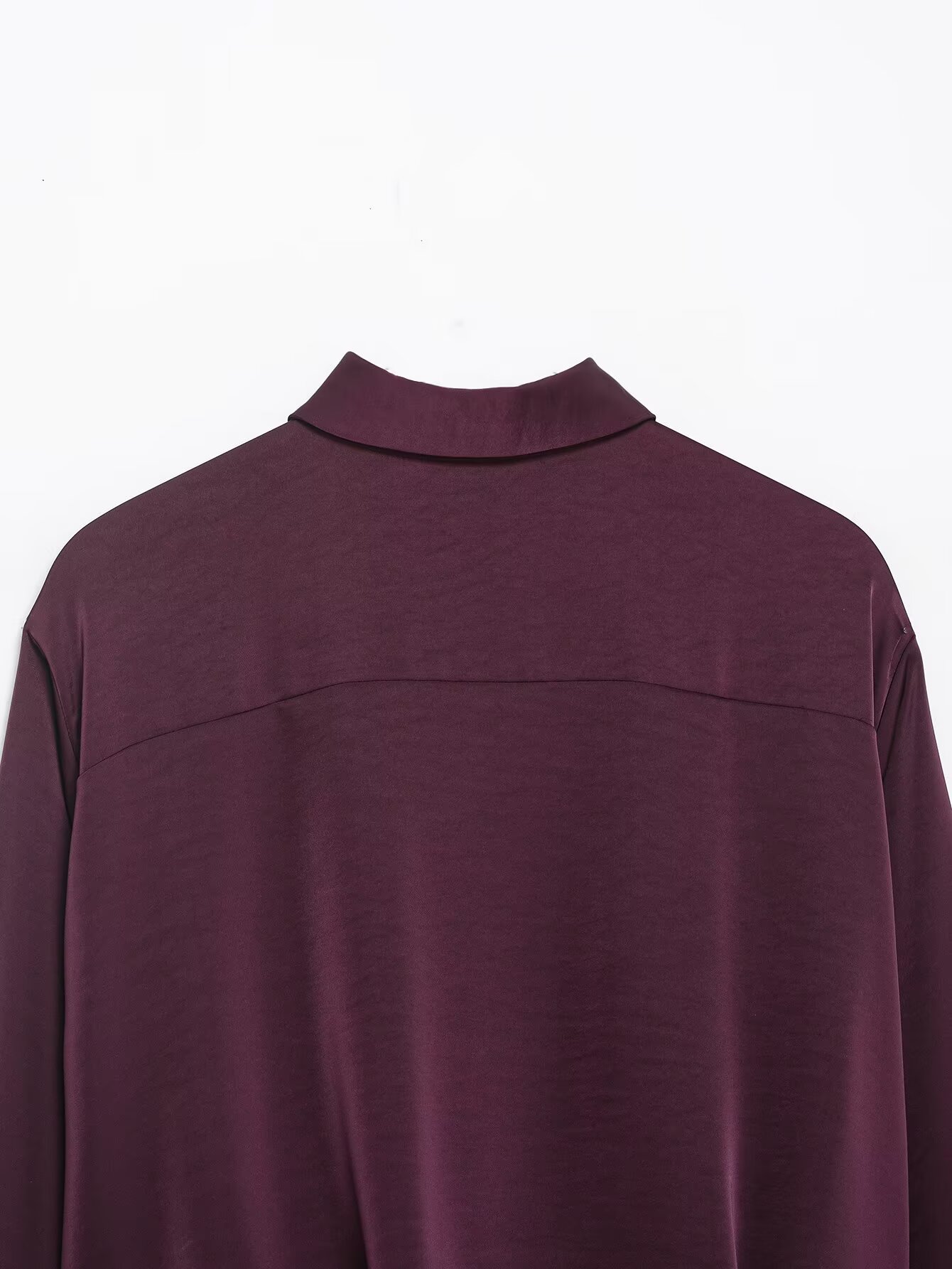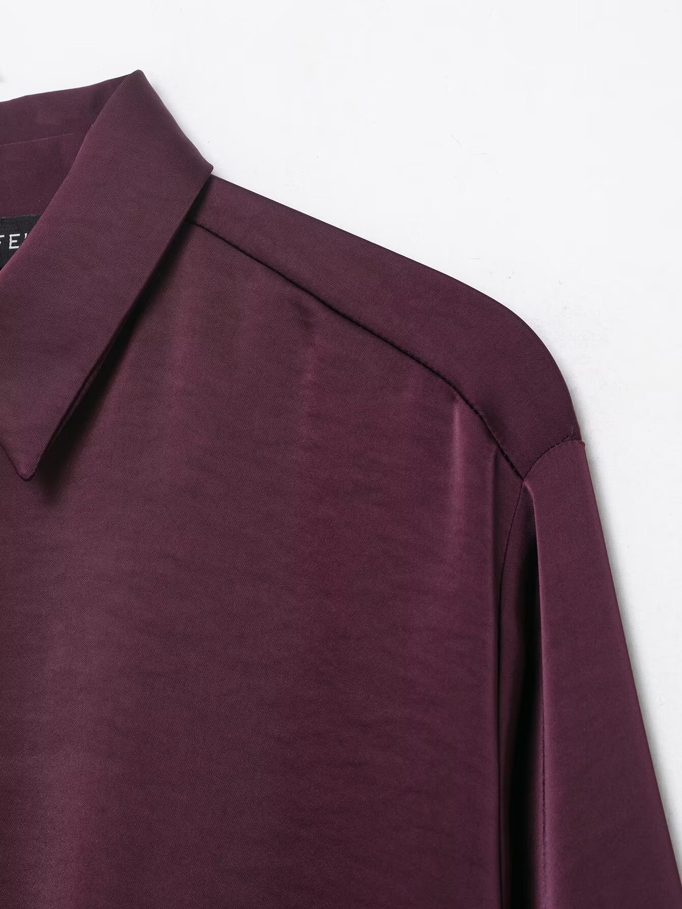 Women Clothing Autumn Retro Easy Matching Wine Red Satin Short Shirt