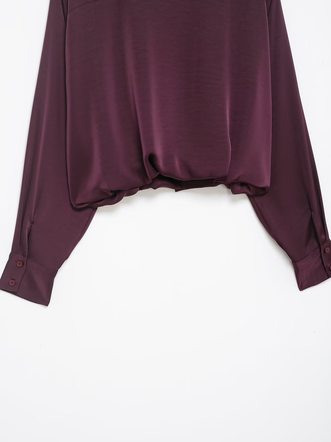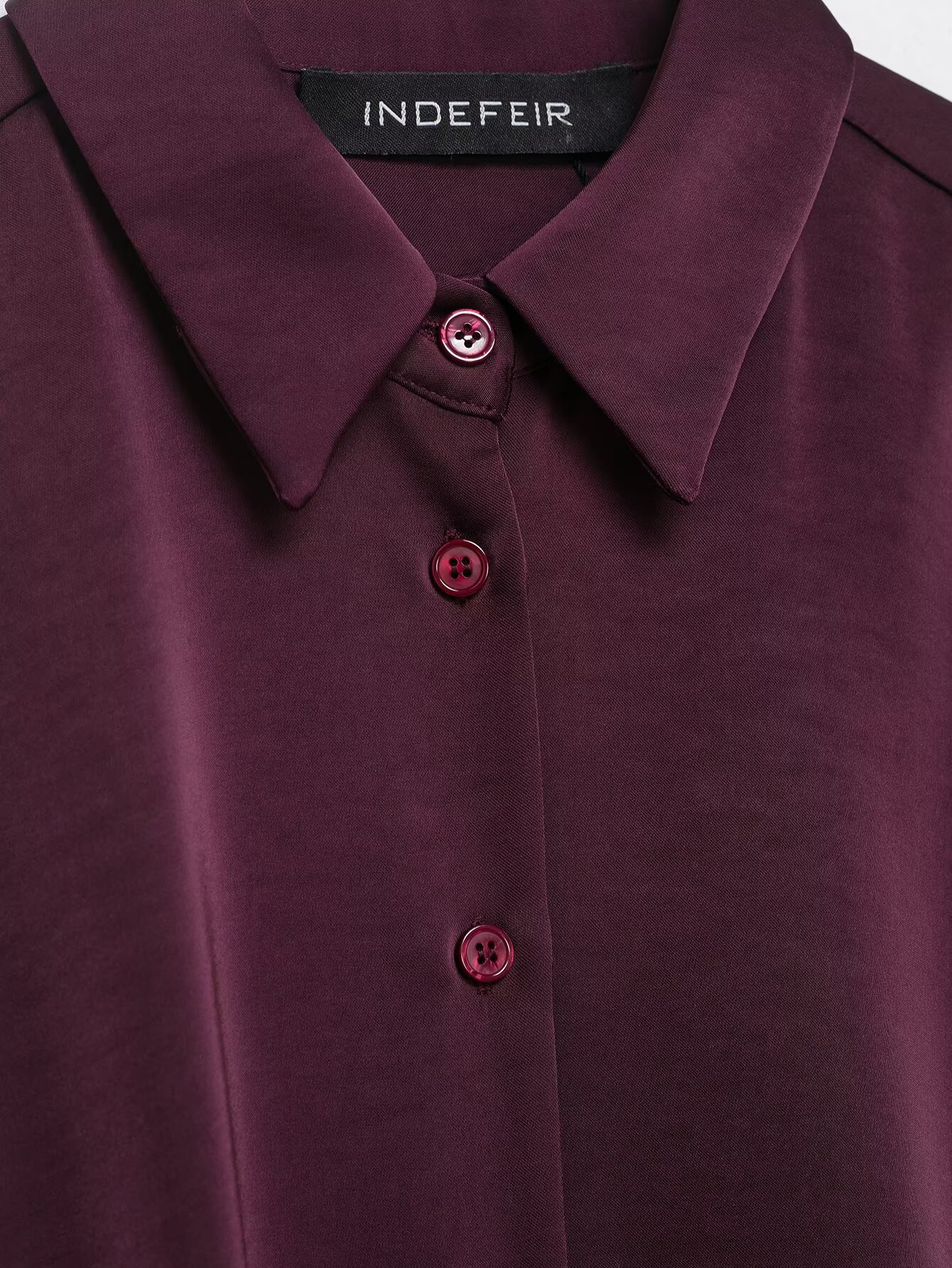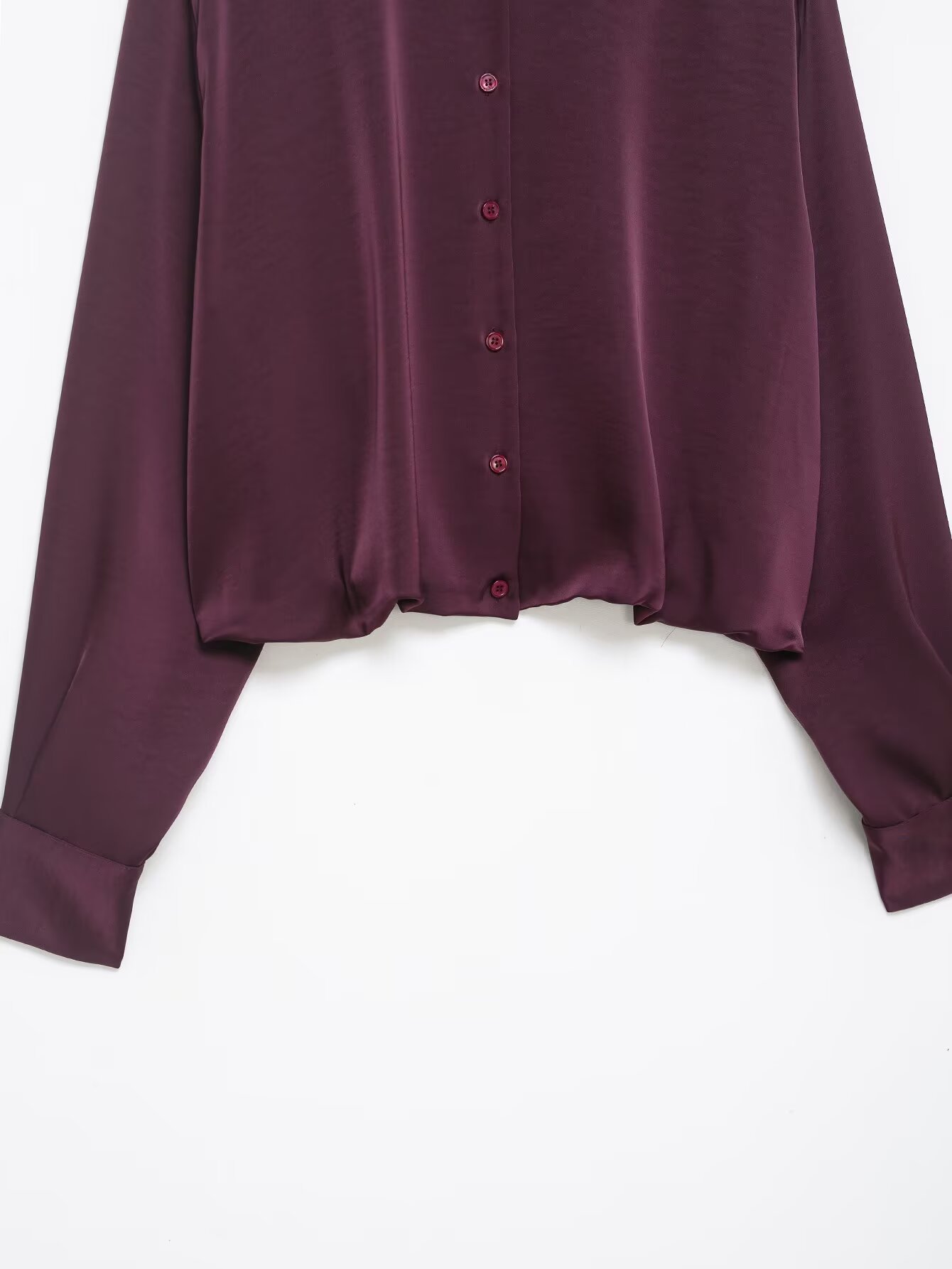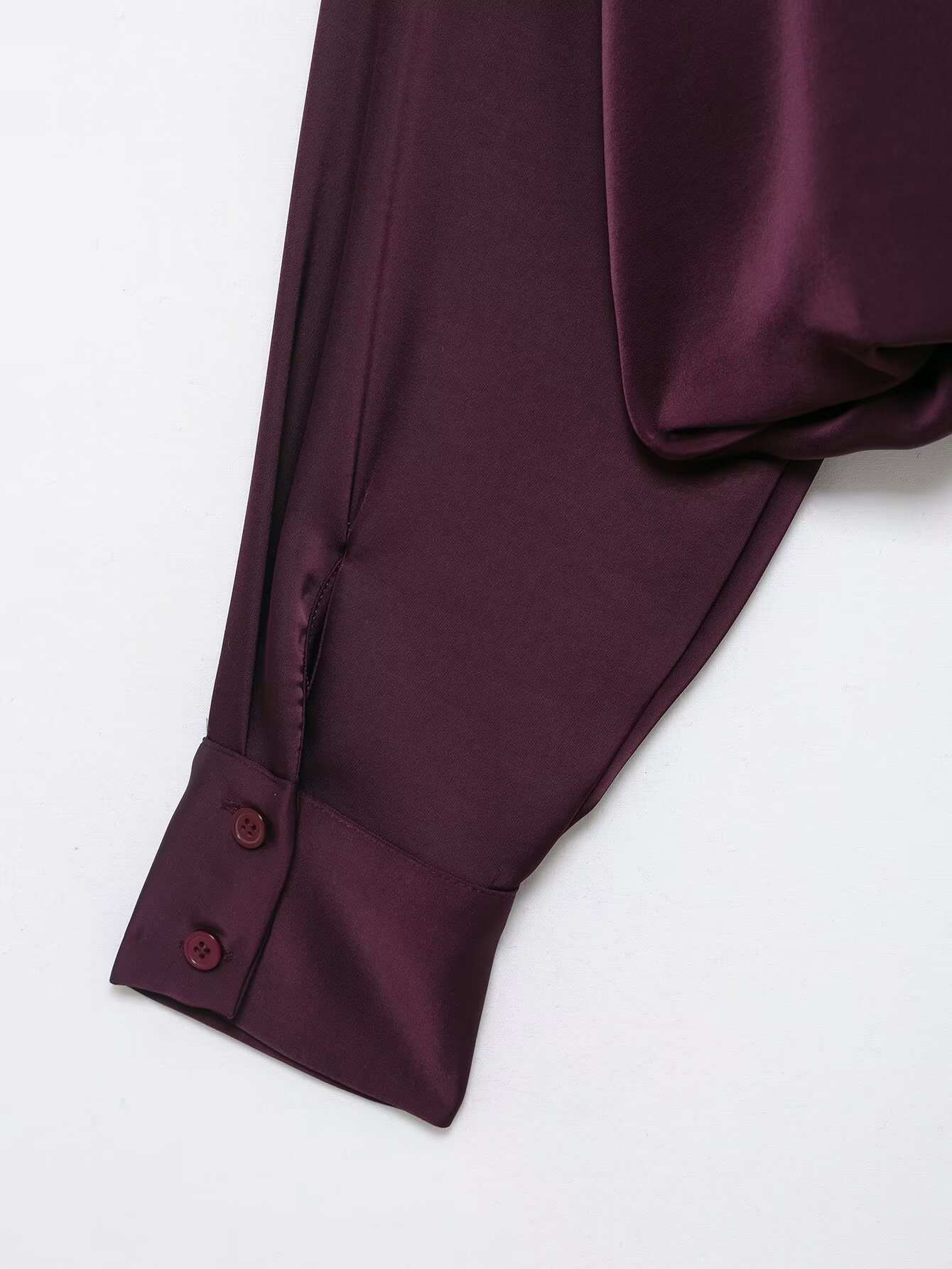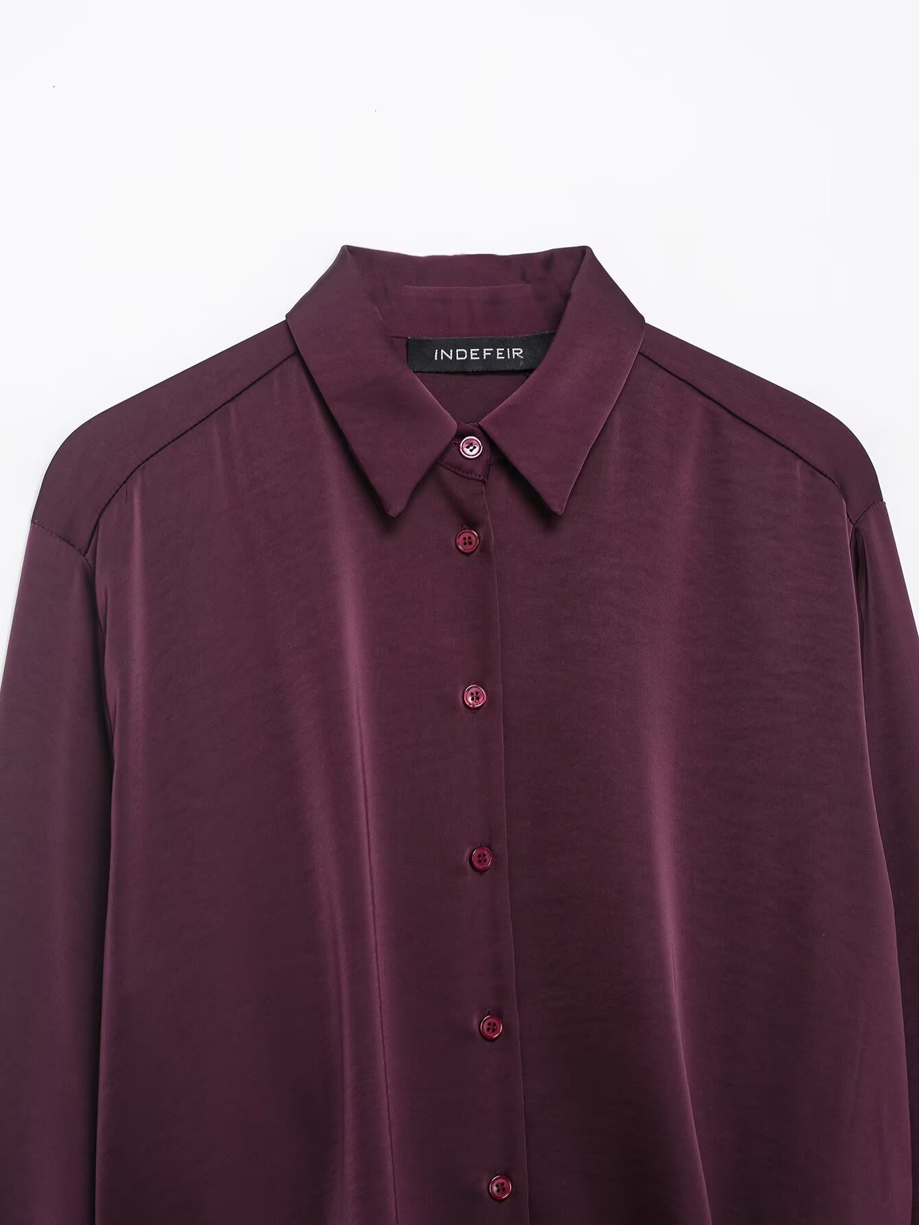 Women Clothing Autumn Retro Easy Matching Wine Red Satin Short Shirt